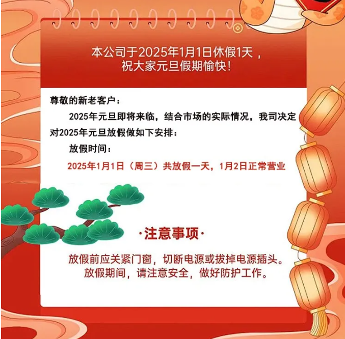 2025年元旦即將來臨,結(jié)合市場的實(shí)際情況,我司決定對(duì)2025年元旦放假做如下安排: