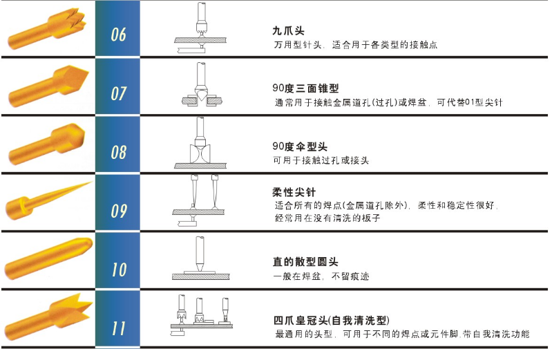 探針是用來測(cè)試線路板的開路或短路的,它的使用方法是通過傳輸電流或電壓信號(hào)來判斷線路板的情況,在測(cè)量中探針頭是主要使用的部位。目前最小的探針外徑可以做到0.2mm,通過這一點(diǎn)我們可以知道其實(shí)針頭的選擇是很有講究的,所以我們可以來看看幾種常見的頭型